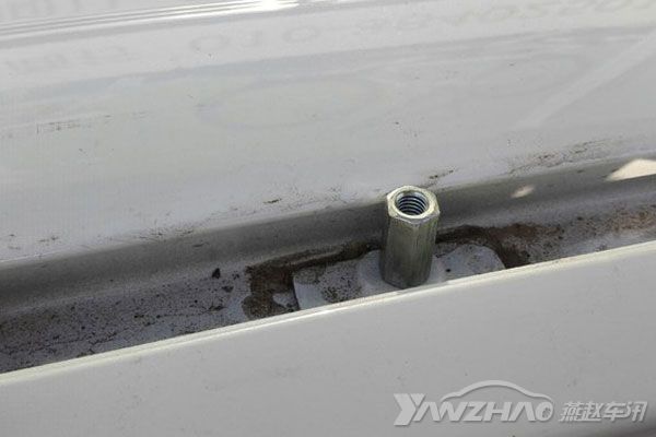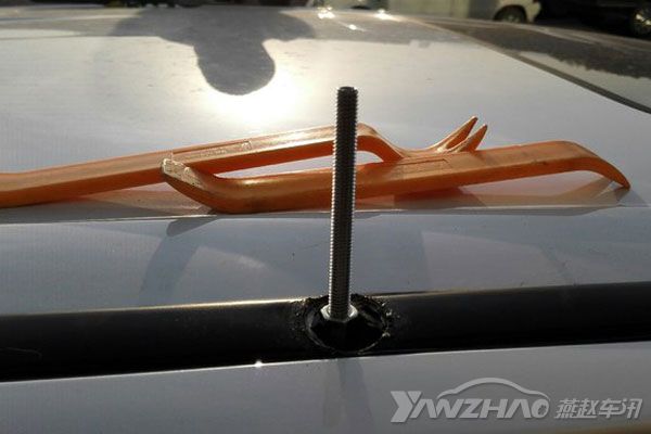 第五步,在刚才安装螺母的地方,安装支持行李箱架的螺丝。然后,将垫片安装螺丝周围,防止安装行李厢架会对车顶造成损伤。