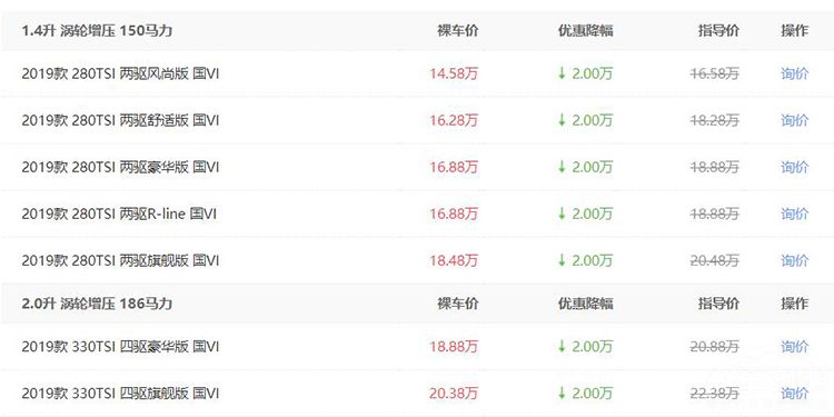 目前重庆地区最高有1.9万元的优惠,全系车型被控制到了20万出头,2.0和2.5的入门车型分别为17.18万和18.48万。同时,目前4S店附加条件有店内置换和店内上保险,并且所有车型颜色可选。