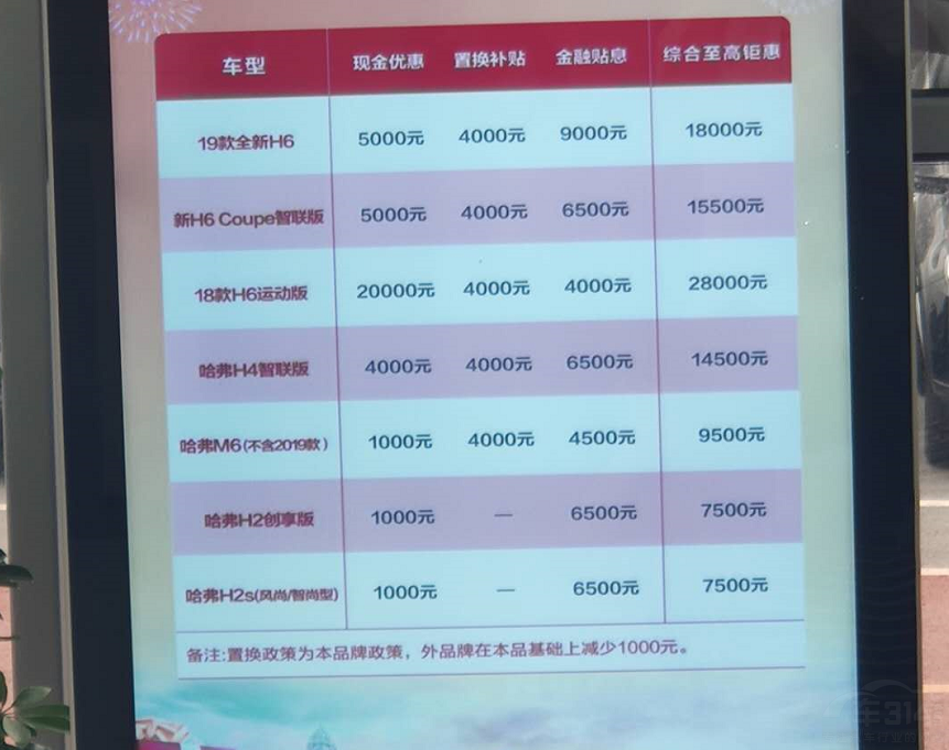 毕竟没有坐下来和销售慢慢谈价格,对第二代哈弗H6的优惠情况销售也只会给我说个大概数字。首先全系车型明面上都有1万的优惠,现在尚有库存的版本比如手动挡优惠就有一万三左右。