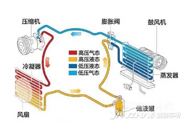 汽车空调制冷系统主要是由压缩机、膨胀阀、冷凝器、蒸发器和鼓风机等组成,其间各个部件之间采用高压橡胶管和钢管连接成一个密闭的系统,在制冷系统工作时,制冷剂会以不同的状态在这个空间里循环流动,而这样的循环又分为了四个过程: