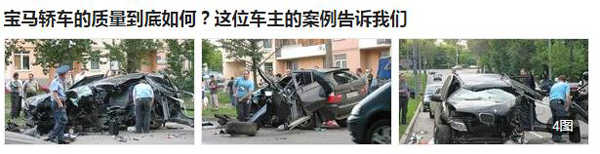 其标题这个人连SUV和轿车都分不清,更不要提专业性了。这篇文章的主要内容就是配了四张现场惨烈的图片,然后再添油加醋的叙述了一遍,最终的结论就是车主毫发无损,宝马很安全。这种文章实在是让人无语,更离谱的一种情况就是小编在网上随便扒了几张图,然后凭借着自己YY的场景描述了一番,一篇博人眼球的新闻稿就大功告成了。