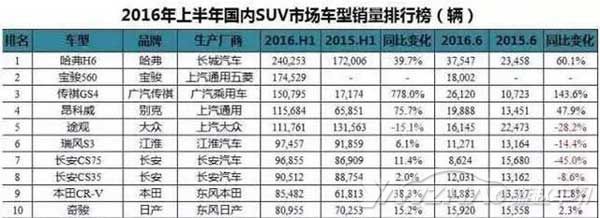 哈弗H6依然稳坐SUV销量榜单的头把交椅,并以单月37,547辆,累计240,253辆的成绩大幅领先位居第二的宝骏560,且销量同比2015上半年增长了39.7%。自从将产品矩阵进行细化、升级后,哈弗车系被分为“红标”、“蓝标”两大阵营,由此,正统与跨界风格的SUV也被分别归入各自阵营,形成较为明显的产品区隔。即便出现了更为运动的H6 Coupe等衍生车型,但销量最火爆的依旧是当家花旦H6,可见对于这个价位车型的消费群体而言,在外观方面被贴有豪放、大气、野性、圆润等标签词的SUV,似乎更受欢迎。
