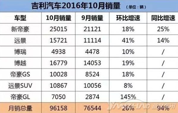 博越:10月份销量1.6万辆