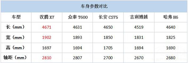 汉腾X7的车身尺寸已经远远的超越了同级竞争对手,而汉腾却非常低调的将这款车定位为了紧凑级SUV。汉腾X7的长宽高分别达到了4671*1902*1697毫米,轴距2810毫米,而以大块头著称的丰田汉兰达,轴距也不过是2790毫米。汉腾X7在车身尺寸上的明显优势,将在乘坐空间上有所体现。