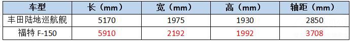 在车身尺寸方面,福特F-150以绝对的优势领先于丰田陆地巡航舰,即使红杉那种全尺寸SUV在F-150面前也要有所收敛,何况是陆地巡洋舰这种中大型尺寸的SUV。
