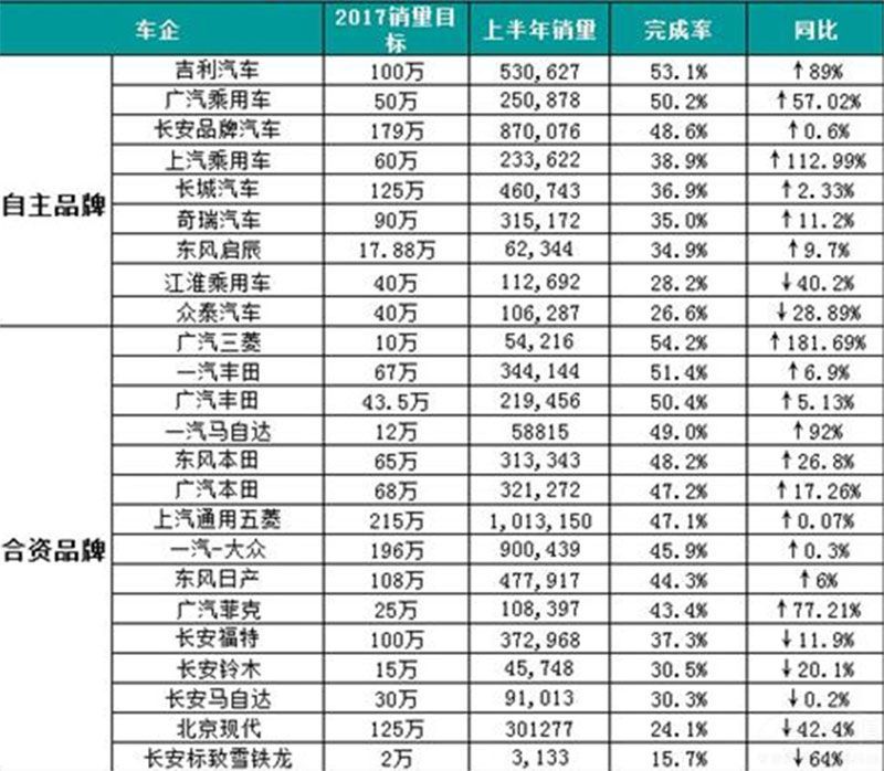 而在过去的6个月中,车企们当初定的年目标大部分品牌都没有完成。只有吉利、广汽乘用车、广汽丰田、一汽丰田、广汽三菱等品牌,完成情况较好在50%以上。至于其它多数品牌,半年来的完成量都是在30%到50%之间。其中,最惨的要属众泰和DS,分别成为了自主与合资里完成量最少的品牌,仅完成了年目标的15.7%和26.57%,看来它们的目标果然只是吹出来看画的!
