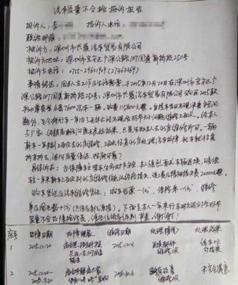 案例:今年315消费者权益保护日期间,就有一份车主亲自手写的“千字”汽车投诉书,被曝光引发了人们的关注。在这份“千字”投诉书上,车主李先生描述了他一年修理22次令人崩溃的遭遇。2015年底李先生花11.5万元,购买了一辆众泰T600,刚提车后车辆就出现抛锚、变速箱异响、方向盘抖动、内饰顶棚松动等各种的毛病,截止到2016年10月份为止,一年不到的时间这辆众泰T600,维修次数竟然有22次之多。