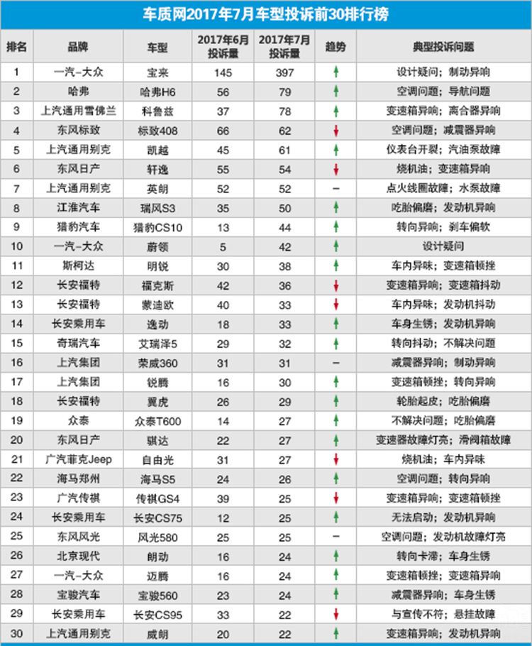 在7月份当中,根据上面这份榜单投诉量最多的车型,就是一汽大众旗下的宝来,高达397例投诉。这款车相信大部分朋友都十分熟悉,它从2001年进入中国市场开始,就非常受到国内消费者的欢迎。但在今年夏天宝来突然投诉量暴增,主要原因是2016款和2017款宝来车型,在车尾排气管上方缺少隔热瓦,导致后备厢内地板因高温而被烤糊。同时,宝来还会经常出现刹车异响,让车主们不胜其烦。