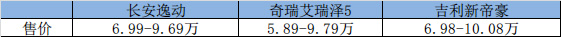 首先在价格方面,上市较早的长安逸动8.09万元起售的价格也最贵。而与之相比,吉利新帝豪最低配只要6.98万元,奇瑞艾瑞泽5起售价更是只有5.99万元。即便5月长安逸动全系官方降价1.1万元,目前6.99万元的起售价依然要高于新帝豪和艾瑞泽5。
