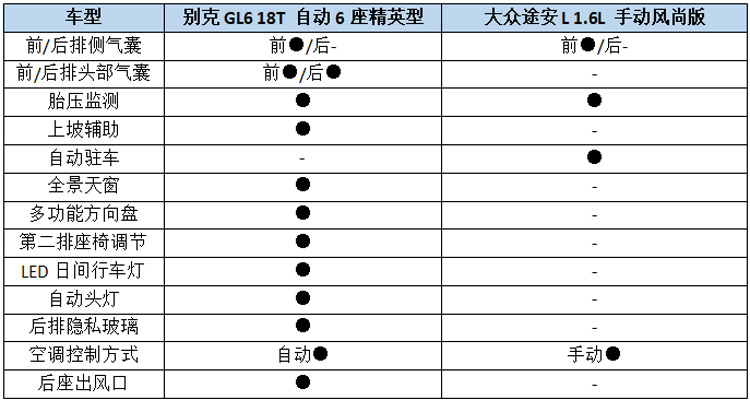 小结:在车内空间布局上,大众途安虽然有五座、六座和七座的版本,但是这款入门级车型上连选装的资格都没有,只是一台普通的五座车。而刚刚上市别克GL6在全系都标配了六座,并且车身长度上还具有一定的优势。配置方面,别克GL6更是令大众途安感到了深深的挫败感,差距尤为悬殊。