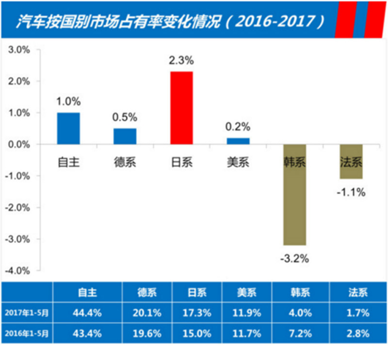 实际上也确实如此,根据中汽协的数据,今年前5个月日系车在华销售了162万辆,同比去年上升17.6%。另外,日系车的整体市场份额也提升了2.3%。至于德系车,今年前5个月在华销售了189万辆,整体市场份额微增了0.5%。这主要是因为上半年,奥迪深陷经销商与厂家的纠纷当中,导致品牌销量并不理想,1-5月份同比下滑了5.9%。所以说,日系车成为韩系车崩盘后的最大赢家,而德系车仅仅喝上了一口汤!
