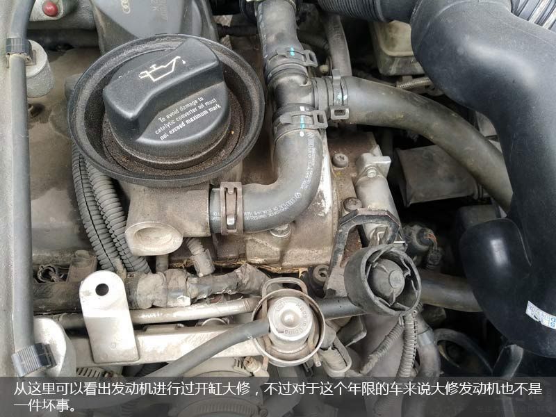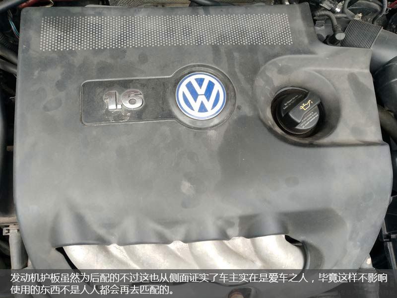 在仔细检查了发动机舱后我发现整个发动机的渗油情况居然不是很严重,这点让我感到非常诧异同时也让我心生警惕。因为作为大众旗下的产品在经过这么长岁月的侵蚀以后不可能没有严重渗油的情况,要知道在打开机盖时我已经做好了“一片狼藉”的心理准备。果然在我的“火眼金睛”之下发现了端倪,整个发动机的边缘有重新打胶的痕迹说明发动机曾经大修过,不过根据发动机重新打胶的工艺程度来看应该也是在正规修理厂进行的修复。在发现这个重大“缺点”以后我赶快的在脑子里记录了下来,要知道这可是砍价时的一个“法宝”。