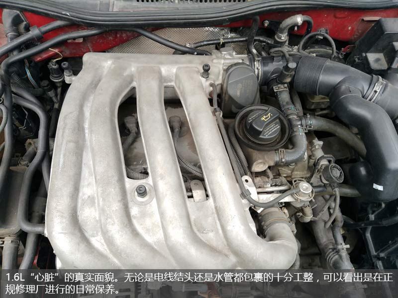 揭开盖板以后,“心脏”就彻底的暴露了出来。整个发动机舱的线束和橡胶管路的接口都十分工整,从这里我心理就判断出这辆车在保养上应该不是在那些路边摊完成的。从这张照片上可以看见许多配件都有奥迪的标识,别惊讶这很正常因为在03年时大众和奥迪的许多配件都是互相通用的,而这也是大众当年打下良好口碑的基础之一。