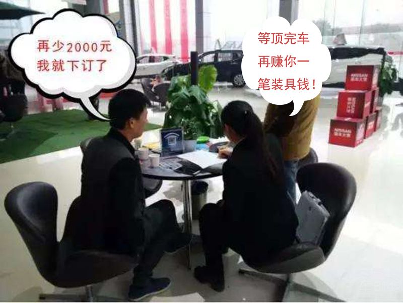 除了上面这种夸奖的话之外,汽车销售们还会用别的心理招数。比如他们在客户提出降低的价格要求后,会说要跟领导申请。但其实,每个4S店销售手里都有一定的优惠限额。他们会利用购车者这种想贪便宜的心理,装做很为难的样子降了价。这样会令购车者得到心理满足,如此不仅能促成车辆销售,接下来他们还能够向购车者提出交换要求,促进二次消费像是在4S店上保险或者做装具等。