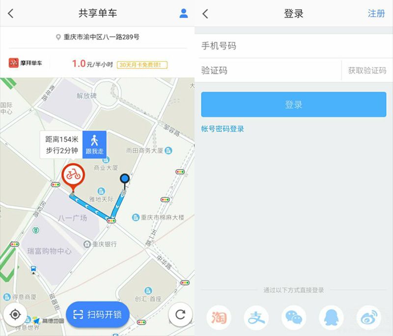 在选择完毕借车地点后,APP会自动为你规划出行走路线并且会标示出距离和行走时间。在顶部也会看见租赁摩拜单车的费用。在到达租车点后,点击扫码开锁就会出现登陆界面,而这个界面是支持支付宝、微信、QQ、微博等支付方式的通过登陆账号后就可以付款进行租赁了。