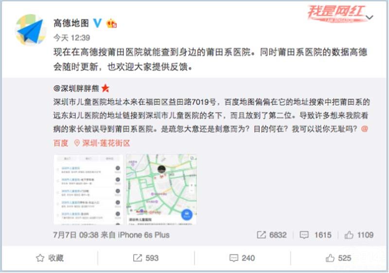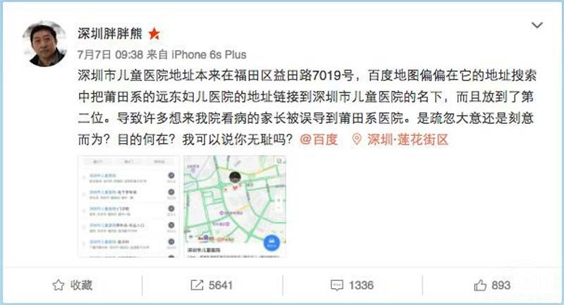 2017年7月7日,微博名为“深圳胖胖熊”的深圳儿童医院副院长麻晓鹏先生发微博表示“深圳市儿童医院”地址本来在福田区益田路7019号,而百度地图却把莆田系的远东妇儿医院的地址链接直接放在深圳市儿童医院的名下,并且还放在了第二位导致许多病人被其误导不仅浪费了病人的金钱还耽误了病人的时间。这不禁让人质疑,百度作为一个国内的互联网企业巨头,居然为了钱能做出这样的事这样一个没有社会责任感的企业究竟是否有着存在的必要,或者说这样一个没有民族感的企业存在的目的是为了什么?难道仅仅只是为了赚钱吗?