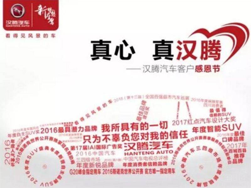 所以,为了感恩客户一年以来对于汉腾的支持,以及倾听车主们的反馈改进意见,跟客户一起让汉腾汽车变的更好。2017年7月到8月期间,汉腾品牌旗下所有4S店经销商,将举行“真心,真汉腾”客户感恩节活动,此次活动将覆盖所有汉腾客户,切切实实地将这份感恩回馈给汉腾广大的车主们。