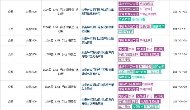 众泰作为国内靠山寨成名的车企实在是有着其独到之处,众所周知它旗下的各种畅销产品都是通过借鉴其他车企的设计而来,当然这样的方式也让它省下了一大笔研发设计的费用。可是既然你都已经借鉴的别人的外观设计那你为什么不同样借鉴别人的过硬的质量呢?有着众泰·途锐之称的T600可就是在质量上吃了一个大亏。而T600的问题虽然都不影响正常驾驶,可对日常的使用还是有着较大的影响。根据车质网的投诉看来它的问题主要是在于轮胎吃胎/鼓包、车身起泡、车身锈蚀等,而且也都是属于批量性的问题可以说基本没有办法进行解决。