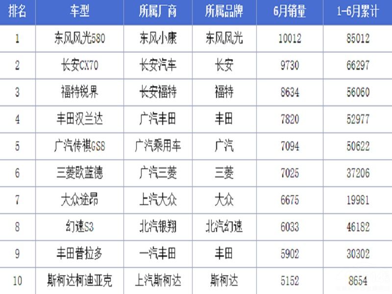 从前十名的榜单上来看,虽然自主品牌夺得冠亚军,但合资品牌还是占了大多数。东风风光580自上市以来热度不减,一直占据着榜首的位置,销量喜人;长安CX70销量上涨获得第二名,但上半年的销量还是比风光580差很多;福特锐界销量下滑,本次排名第三;丰田汉兰达销量急速下滑,本月销量不足8000,排名第四;广汽传祺GS8销量变化不大,依旧排在第五名。其余上榜车型中,欧蓝德上升较快,同5月相比销量提升近2000辆;柯迪亚克超过全新胜达排名第十,也是一个不错的成绩。