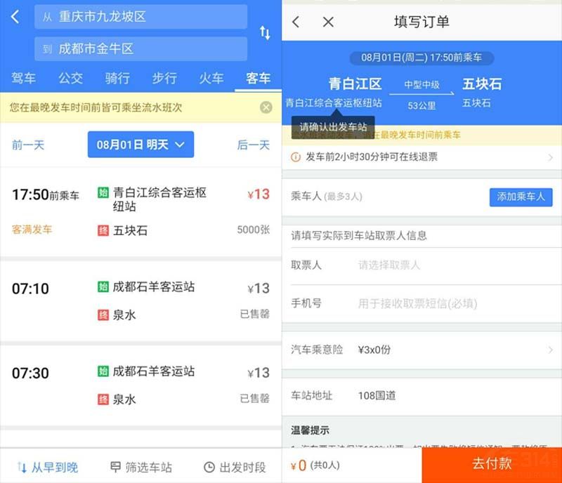 既然有火车的售票服务那么汽车当然也是少不了的,汽车的售票就在火车按钮的旁边只要点击进入就能够看到用户所选线路的汽车了。汽车的购票方法和火车大致是一样的,只要用户根据上面的时间和班次选择好了以后就能够直接进行购票了。