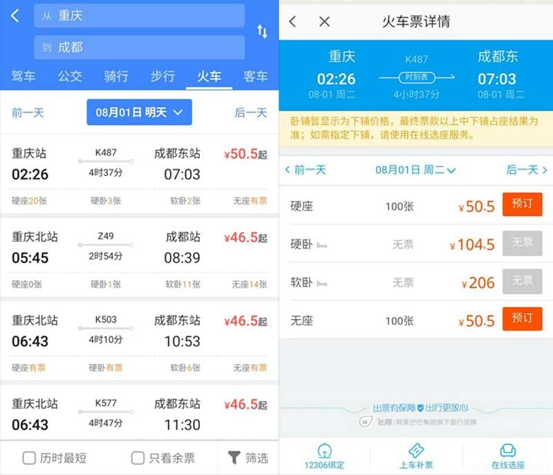 高德还接入了火车票的购买平台,同样这个平台的位置也是在出行选择栏,用户只需要点击“火车”就能够进入这个界面了。在进入这个界面后用户只需要在上方的导航栏里输入出发地和目的地就能够看到相关的车次和购票信息了。在浏览完购票信息后用户也能够直接通过这个界面对自己所选择好的班次进行购票,实在是非常的方便、快捷。大大的节省了用户的时间和精力。