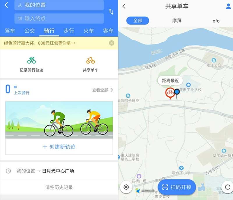 首先开放的是骑行功能,在进入出行方式的选择项后点击骑行功能就能够看到共享单车在平台上的接入口了。点击软件上的共享单车按钮后,高德地图就会自动为用户搜寻出距离用户最近的共享单车位置,并且能够提供导航功能让用户能够找到最短的距离到达单车的地点。在找到单车后用户还能通过下方的“扫码开锁”直接用高德地图对单车进行租赁。