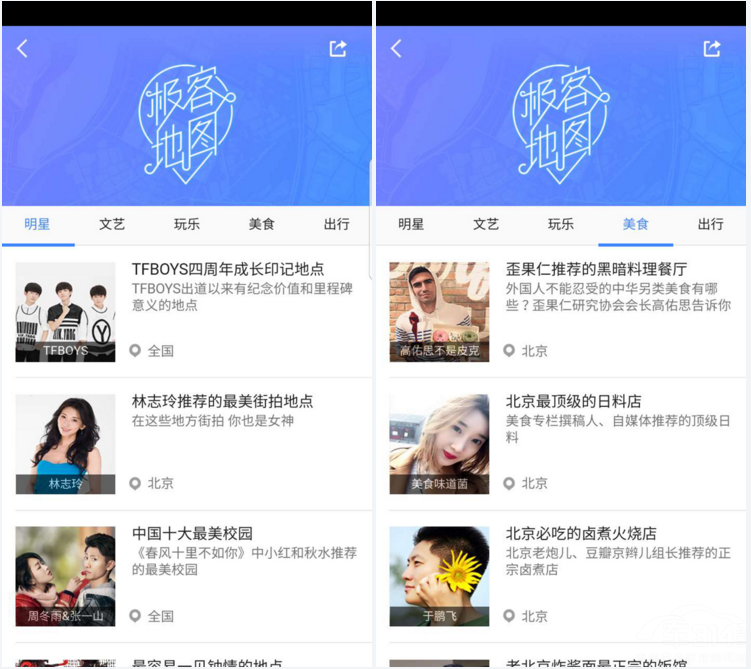 其中,各种大咖、时尚极客的推荐类别分为五种,包括明星、文艺、玩乐、美食以及出行。在每个种类推荐里,用户都能够看到很多不同的信息,比如女神林志玲推荐的最美街拍地点、经典电影中的背景去取景地、歪果仁推荐的黑暗料理餐厅......五花八门各种各样好玩、好吃、好看的去处,内容十分的丰富。