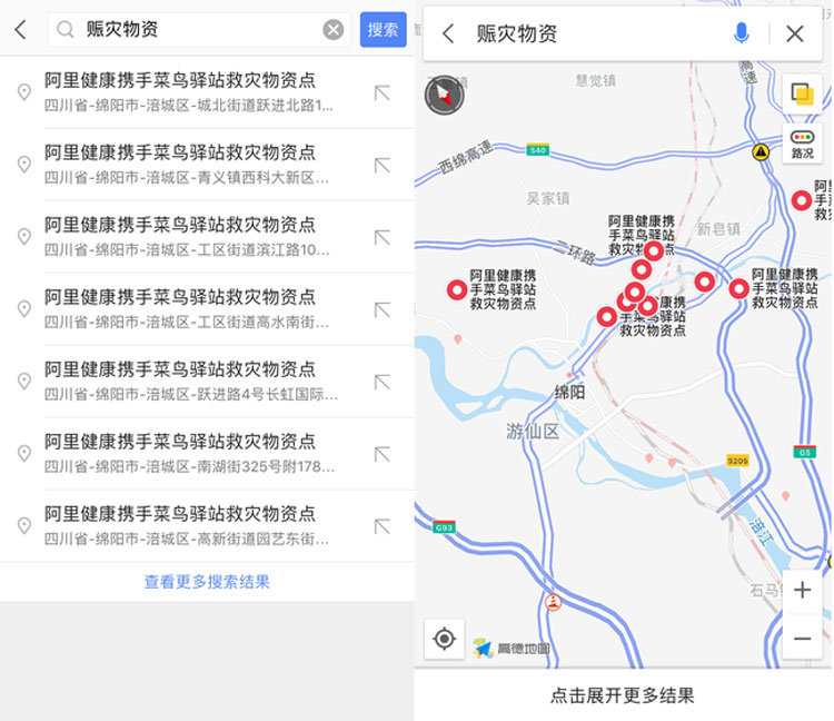 这些都是高德在全心全意为大家服务,为了能尽快解决灾区的问题,联合阿里开展了实际行动。如果你是灾区的朋友只要在首页搜索框内输入“赈灾物资”就能查看附近的就灾物品领取地点。这是阿里健康提供物资,菜鸟驿站提供地点,高德地图标注地点,为的就是方便大家前往领取,能尽微薄之力。从地图上看到阿里健康携手菜鸟驿站救灾物资点遍布了整个震区,有需要的朋友可以点击就近的站点导航过去就可以了。
