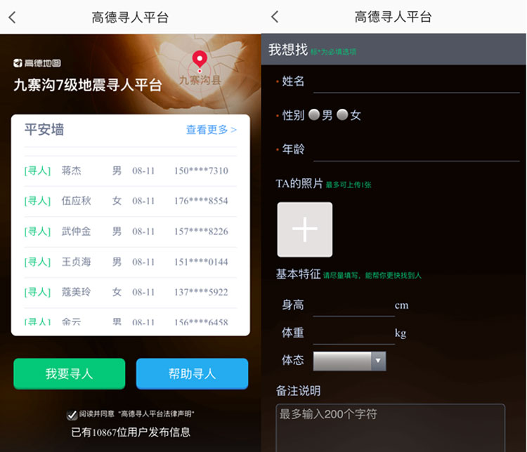 点开图标后,就会看到“九寨沟7级地震寻人平台”,下面有一个平安墙,是给大家用来发布和查看信息用的。你能看到信息分为两种,一种是我要寻人,一种是帮助寻人。两种方式差不多,最终都是为了寻找亲人,在浏览的时候多留一下,也许你身边的朋友也有人正在寻找他们。