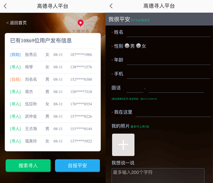 我们看到的平安墙是滚动的,为了能更准确的看到自己要找的亲人或朋友,点击更多后就能动手滑动来查看信息。这里我们能看到搜索寻人和自报平安两个入口,毕竟有上万条信息,点击搜索进入后就能通过姓名和电话直接查找到了。如果你没有找到的话也可以自报平安,输入联系人及姓名、手机号等等就能在高德寻人平台上留下你的信息,方便那他们看到。