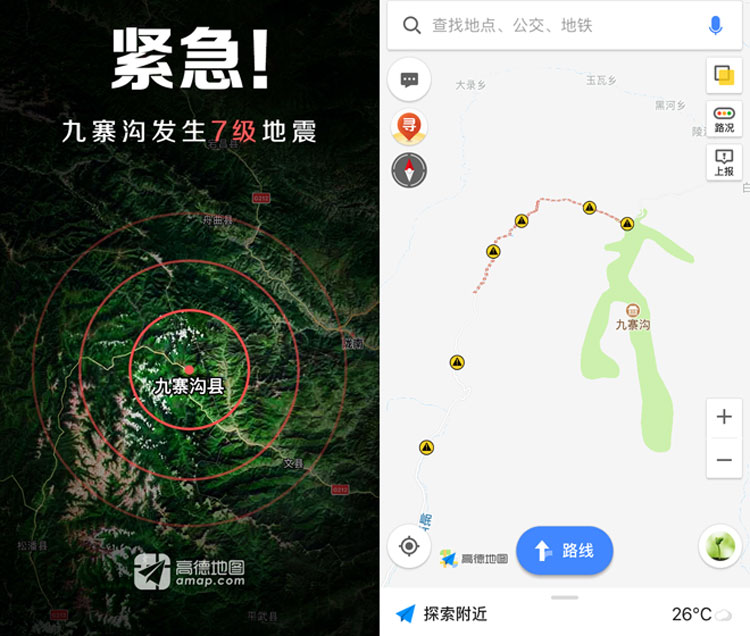 8月8日21时许,四川九寨沟县发生了7级地震,许多地方都发生了塌方,造成了巨大的损失。在第一时间国家及各路救援队伍马不停蹄的前往震区救灾,高德地图也第一时间为大家更新了最新路况信息,及时为大家开辟安全道路,随时播报最新进展。震后许多亲人朋友也非常着急,为了能在第一时间找到自己的亲人,高德地图立马构建了寻人平台,希望大家都平安无事。