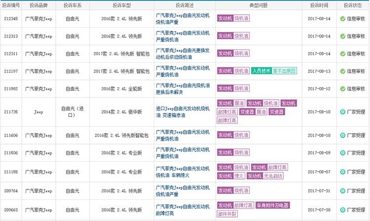 在Jeep高达94起的投诉量中有92起都是由它旗下的自由光车型贡献的,而这样的贡献对于Jeep品牌来说想必是十分不愿意看到的。其实自由光车型早在推出之时就一直存在诸多问题,而这些问题时至今日都还困扰着众多的消费者。首先,它在进口车型时所搭载的9速变速箱,就存在漏油、低俗顿挫、换挡逻辑等问题,而为了解决这问题美国本土还曾召回了10万台问题车型对变速箱进行升级程序以期望来解决这个问题,可是据后续情况来看结果并不理想。其次,除了变速箱问题外,现在国产的自由光车型的发动机普遍存在烧机油、熄火、仪表故障灯亮等等一系列问题。而且有国内车主表示,在更换发动机后依然解决不了问题,试问Jeep作为一个老牌的造车企业难道真的连靠谱的发动机都做不出吗?