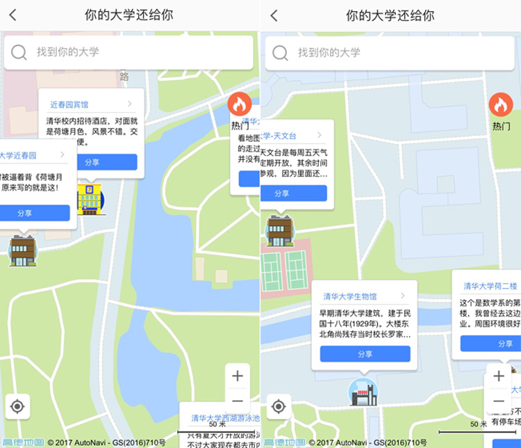 编辑总结:高德“校园地图”已经上线了,大家都能找到自己的母校,在曾经最熟悉的地点留下自己的评论或吐槽。同时也为那些即将入学的学弟学妹们提供了校园攻略,我们也能找回当年的青春回忆,还原最精彩真实的校园。