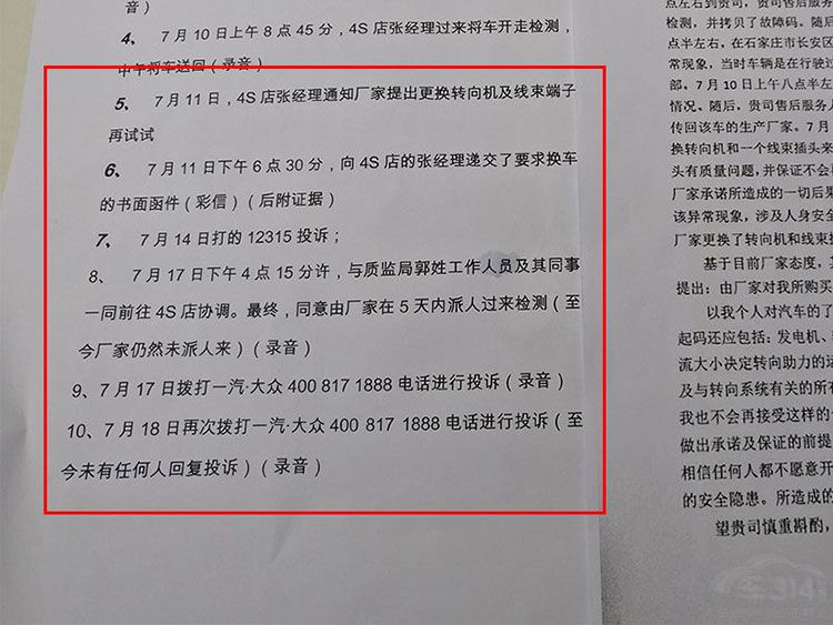 事后,既生气又心有余悸的赵女士,开始向石家庄冀中4S店和一汽大众厂家讨要说法。并且,根据国产《家用汽车产品修理、更换、退货责任规定》(汽车三包法)提出了换车的要求。但4S店态度推脱,一汽大众厂家对这样严重的质量事件,也没有引起应有的重视。车主只能找到了石家庄当地的质监局进行调解,最后在经过半个月的等待后。7月25日,厂家终于派来了代表。