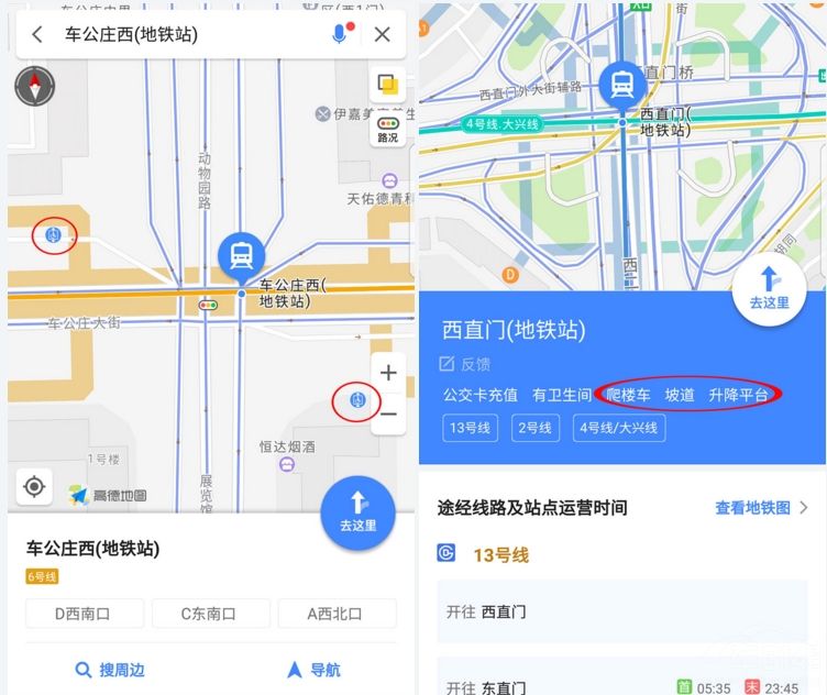 此外,朋友们也可以直接放大你所在地铁部分的地图,在地图上会有无障碍电梯的标识,通过点击标识,大家同样可以十分便捷的找到无障碍电梯。同时,除了无障碍电梯之外,高德地图还会在每个地铁站的具体信息中标注其它的无障碍通行方式,比如坡道、爬楼车等。
