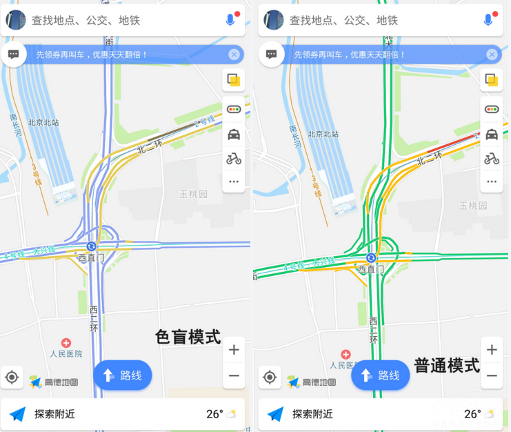 “无障碍地图”的出现无疑对于老人,孕妇、小孩、残障人士等人群意义巨大,但这还不是高德地图唯一贴心的地方。此前,高德地图还上线了能够帮助色盲色弱人士出行的“色盲地图模式”。