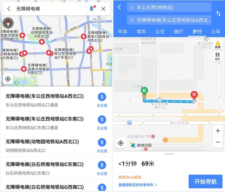 “无障碍地图”的具体使用方法很简单,打开高德地图APP后,在主页面输入“无障碍电梯”高德地图就会将你所在地铁区域内的无障碍电梯全面标注出来。然后,选择你要去电梯,点击“去这里”高德地图的导航功能,会为用户指引如何快速安全的到达目的地。