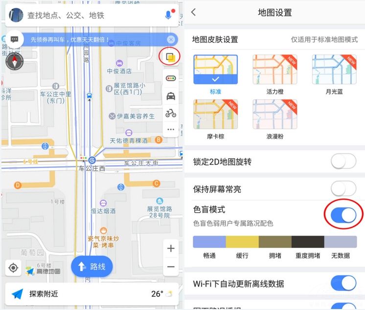 在用户进入高德地图主页面后,点击右上角的“地图设置”图标,开启色忙模式,高德地图就会将原本表示有拥堵、通畅的红绿色标识,改变为能够被色盲色弱人士识别的专属配色。从而让他们也能清楚的知道,出行时交通路况的信息。