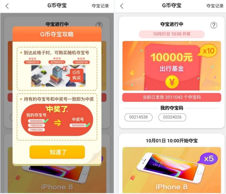 最后,跟普通大富翁的规则一样,每位用户第一次进行游戏的时候,高德都会给玩家发放10000 G币作为基础资金。大家可以以此参加各种游戏,赚取更多的G币。至于这些G币的用处可谓相当丰富,不仅可以用1万G币兑换一个夺宝活动的号码。在10月1日开奖时,赢取iphone 8、米家扫地机器人、美图手机等优质奖品。
