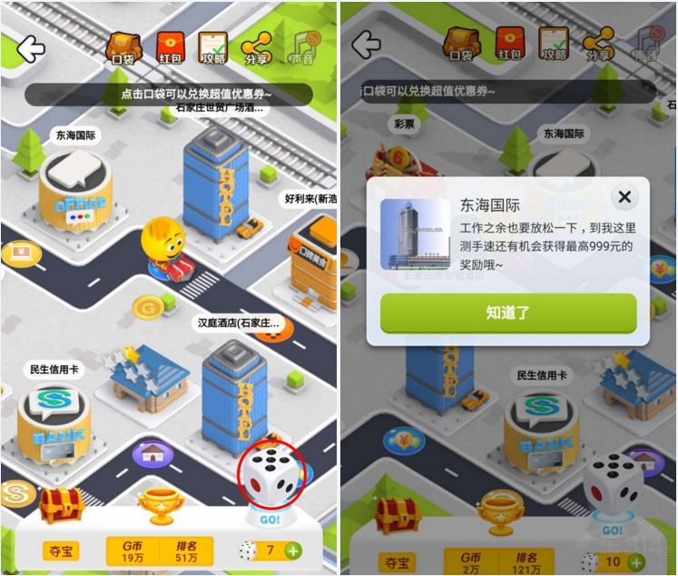当进入“地图大富翁”活动页面后,我们会看到右下角有一个骰子,点击骰子后,地图上的代表玩家的小人会按照骰子摇出的点数前进。在到达某个建筑物或者是路上的图标后,会触发相应的游戏。至于具体每个建筑物,会有什么游戏,大家可以点击游戏地图的建筑物,上面会有相应的介绍。