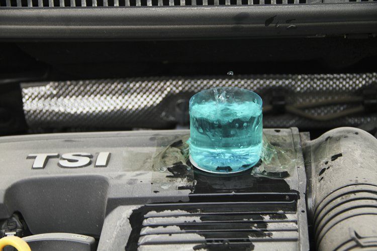 在关闭引擎的情况下,在这两款车型的发动机上用胶带固定一个塑料杯(两车使用的是同一个);然后用烧杯量出200mL的玻璃水,倒入发动机上的塑料杯中,直到即将溢出为止;随后启动车辆,并开启空调,使发动机维持运转1分钟;最后,再将塑料杯中的玻璃水倒入烧杯中,看这两款车谁剩余的多。