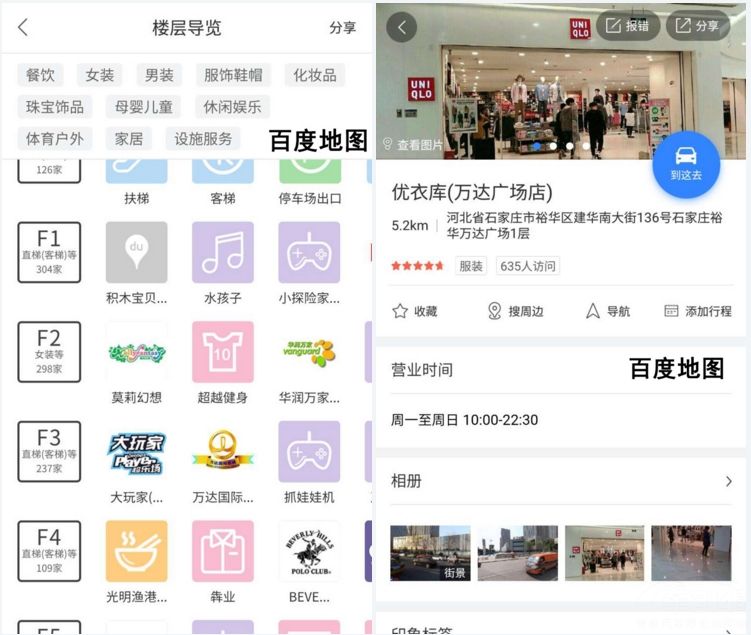 首先,进入两款地图软件后,我们搜索当地的商场,高德和百度都会弹出相应的页面。从页面的人性化角度上看,无疑高德地图的页面做的更吸引人。除了显示出商场的地址、线路距离、搜索周边这些常规功能外,还将热门商户和楼层标识了出来,配上图片给人感觉十分直观。
