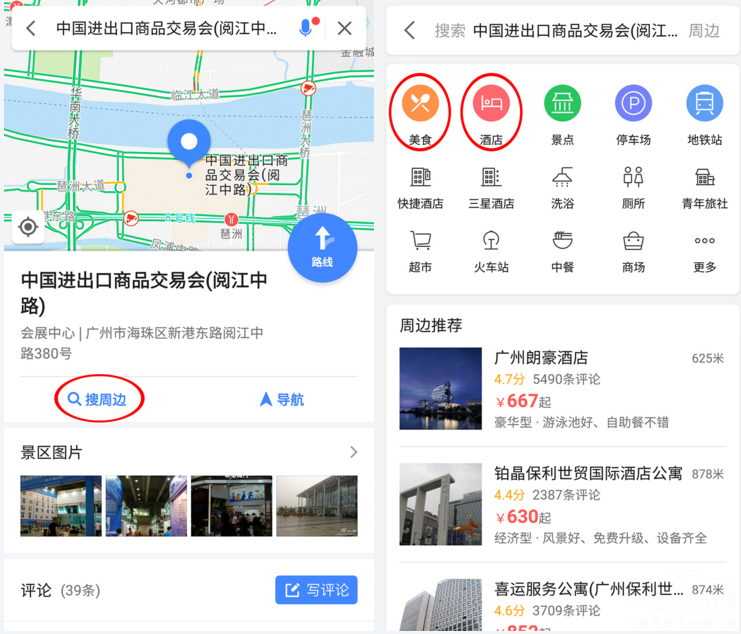 到了目的地后,下面该解决食宿的问题了!这时高德地图的“搜周边”功能,就能够大派用场。在高德的主地图页面,查找“中国进出口商品交易会展馆”,地图上便会显示出它的详细位置以及信息。而在左下角大家会看到“搜周边”的选项,点击进入之后,在功能页面我们可以找一切需求的地方,包括酒店、美食、景点等一应俱全。