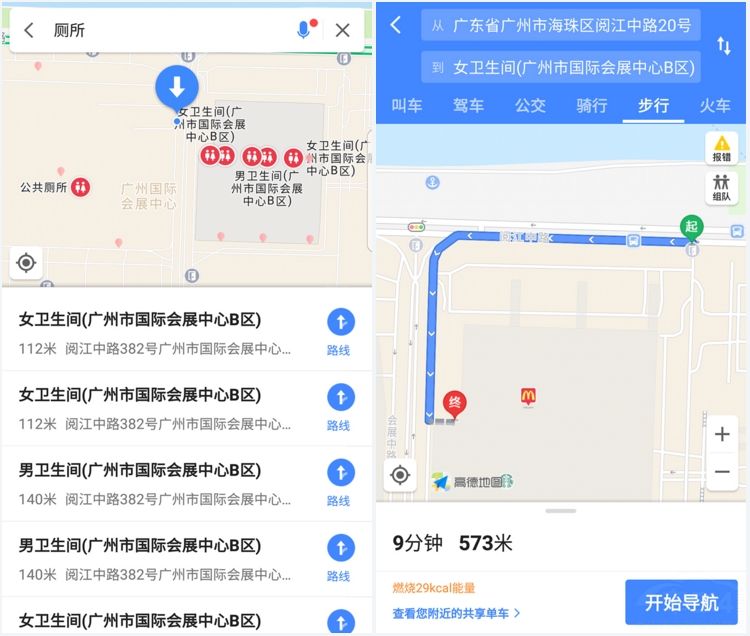 此外,由于车展场所是封闭的,进去之后很长时间都无法出来。因此,逛车展时吃喝以及上卫生间等,就成为了令人头疼的一个问题。不过,大家不用担心,高德地图的“搜周边”功能还提供了展馆里餐厅和卫生间的位置,可以利用它的步行导航轻松找到。有了如此贴心的高德之后,无论谁都可以舒心畅销广州、玩转车展!