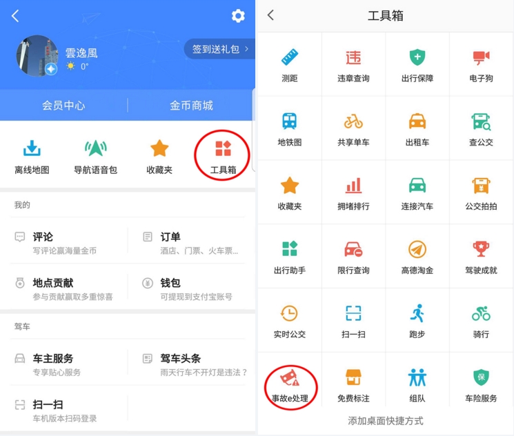 这个APP就是现在很多朋友都在使用的高德地图,在它的“工具箱”里,有一个“事故e处理”的功能。这项功能是由国家交警部门,官方认证的一个交通事故处理系统,目前全国许多省份地区都在使用。