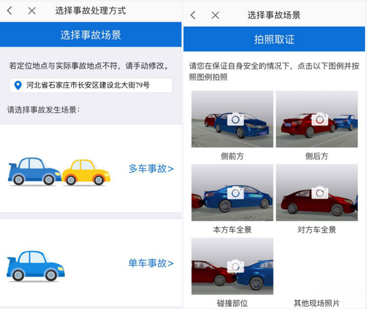 点击“事故处理”,接下来车主们就会进入了快速处理事故的流程。首先,大家要进行的操作是对事故地点和事故情景的选择,有多车事故和单车事故。而后就需要车主们对事故车辆,进行多角度拍照取证。取证的照片一定要清晰,能够体现出事故的真实情况。