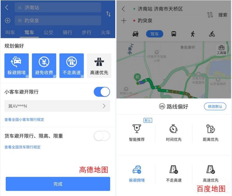 此外,在路线优化选项中,高德地图可以兼顾躲避拥堵、避免收费、不走高速等多种要求,还提供了避开限行的服务。而百度地图则只能在这些路线优化中选择一种,无法进行多项要求的整合。因此,显然在这种路线优化的细节上,高德也要比百度更胜一筹。