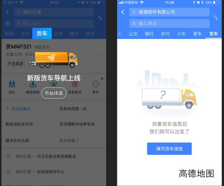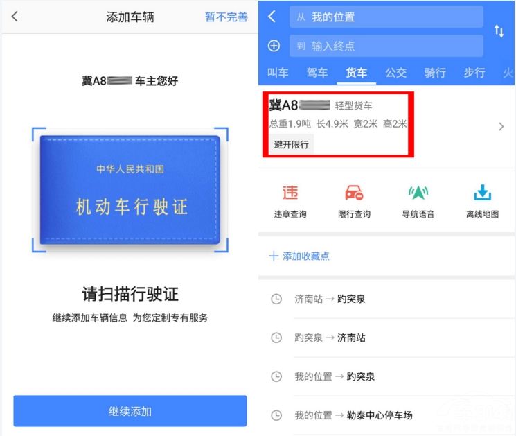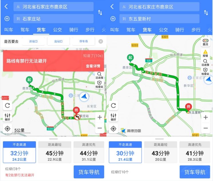 就像上图中一样,有些路段货车根本无法进入比如火车站,而有些地方则没有问题。这些高德地图都会在规划路线时,向货车司机进行提示。