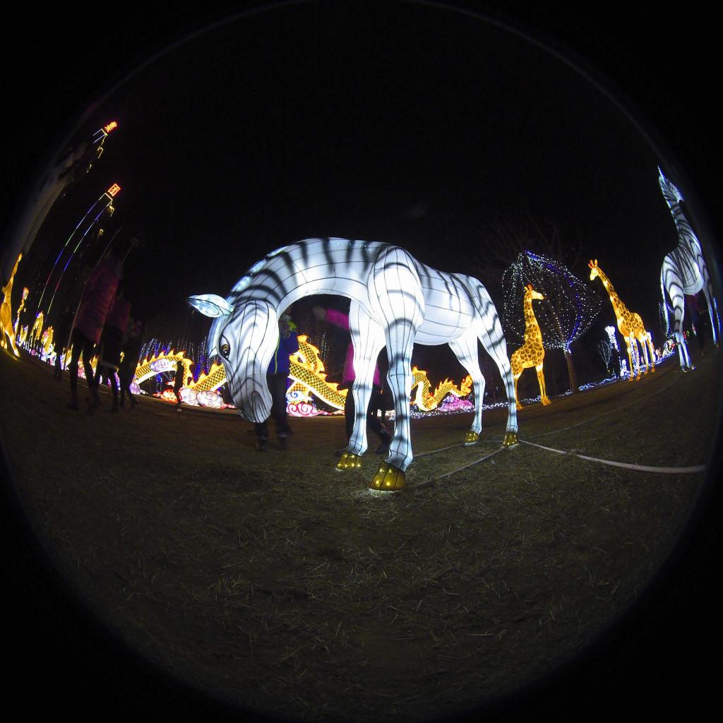 第1天 斑马在低头吃草,游园灯会的所有灯组,都历经了打样—搭骨架—裱糊—装灯—造景,历时一个月纯手工打造而成。通过Camorama4K全景摄像机的拍摄,更加显得像一个动物园了。