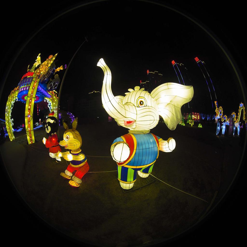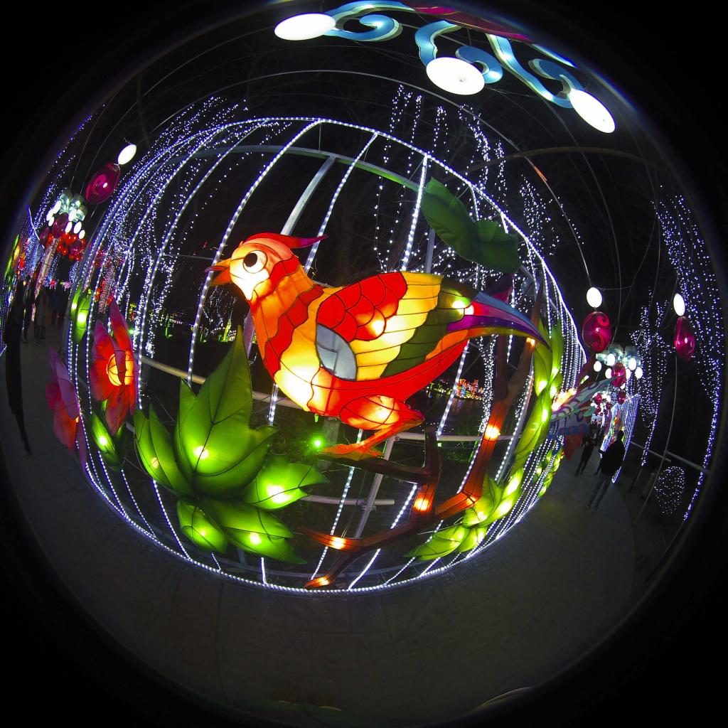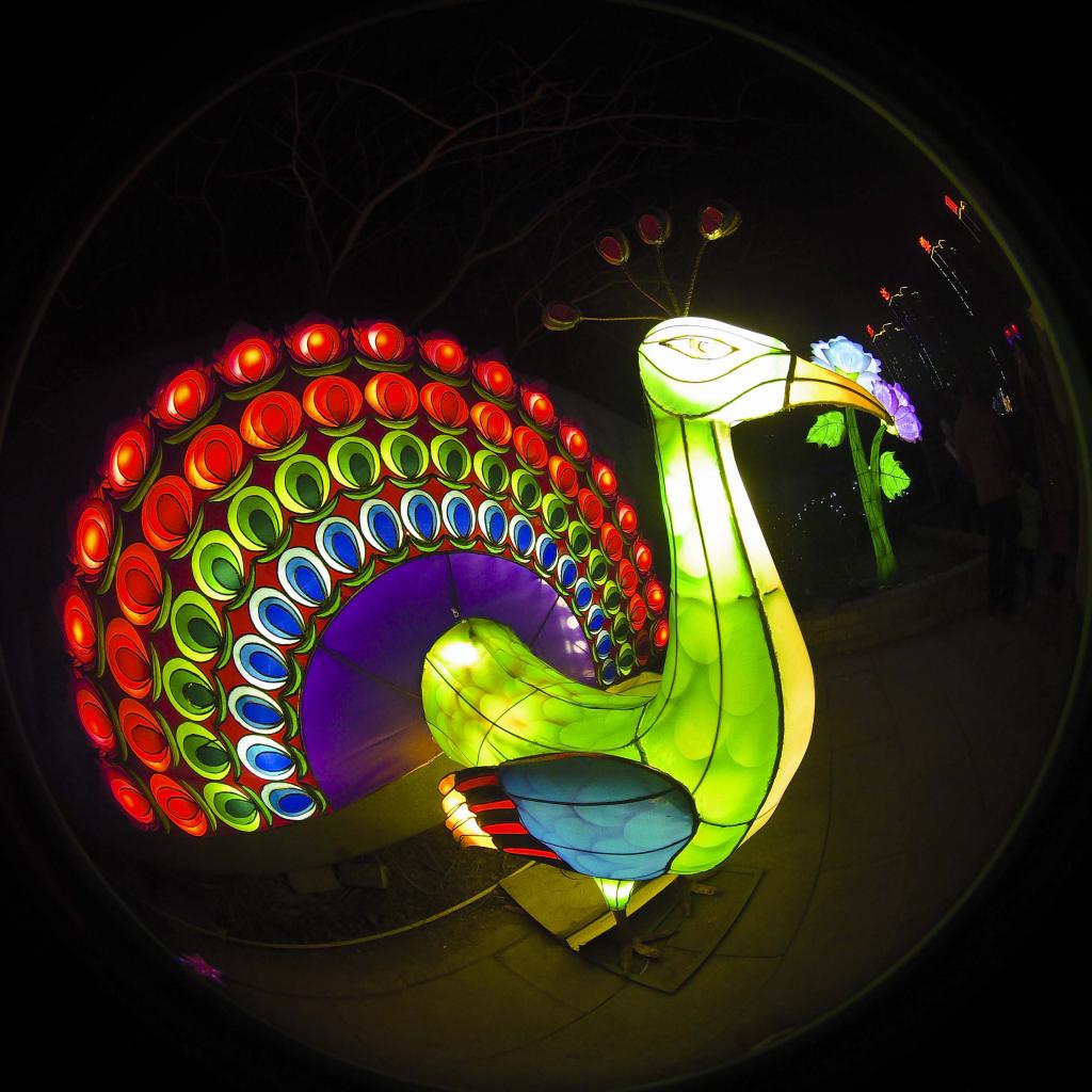 第1天 走进游园会,仿佛走进了一个动物园。Camorama4K全景摄像机可以将整个孔雀花灯都收入到照片里。